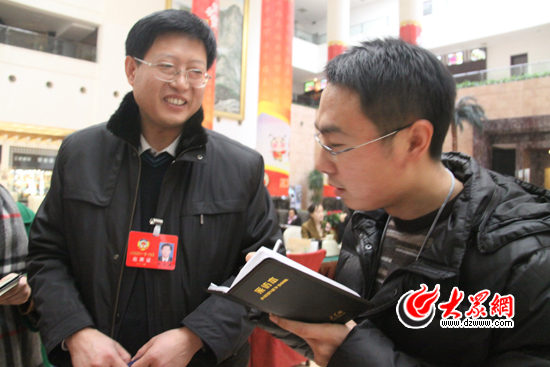 山東省十一屆政協一次會議委員史文憲在報到現場接受大眾網記者采訪。