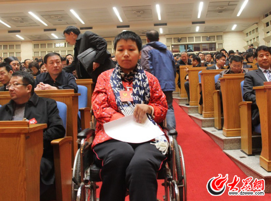 群眾代表鐘倩乘坐輪椅來到會場,被省政協工作人員安排在會場中部旁聽大會。
