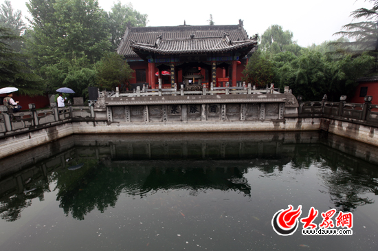 泉池長26米,寬14.5米,深2米,池岸由青石砌壘,東西向架一虹橋,臥于碧波之上。大眾網(wǎng)記者 楊春衛(wèi) 攝