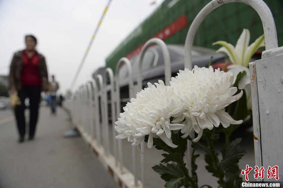 10月13日,北京石景山喜隆多商場火災(zāi)廢墟前,擺放有民眾為救火犧牲戰(zhàn)士獻(xiàn)上的鮮花,路人駐足圍觀。廖攀攝