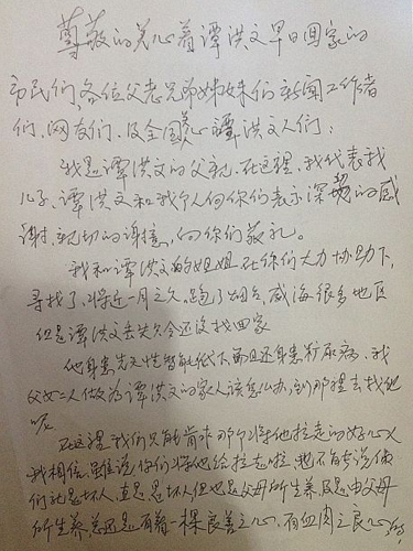 “媒體這么大力度的宣傳,30多天都沒有找到他,所以我和我爸推測小文應該是被人帶走,并看起來了。”譚春玲告訴記者,最近她跟她父親在一起議論這個事情的時候,都推測小文可能被帶到養殖場或者礦上上去做免費勞動力了,無奈她爸寫了一封信,希望通過媒體和網絡公布出去,讓帶走小文的人看到,能讓他回家。