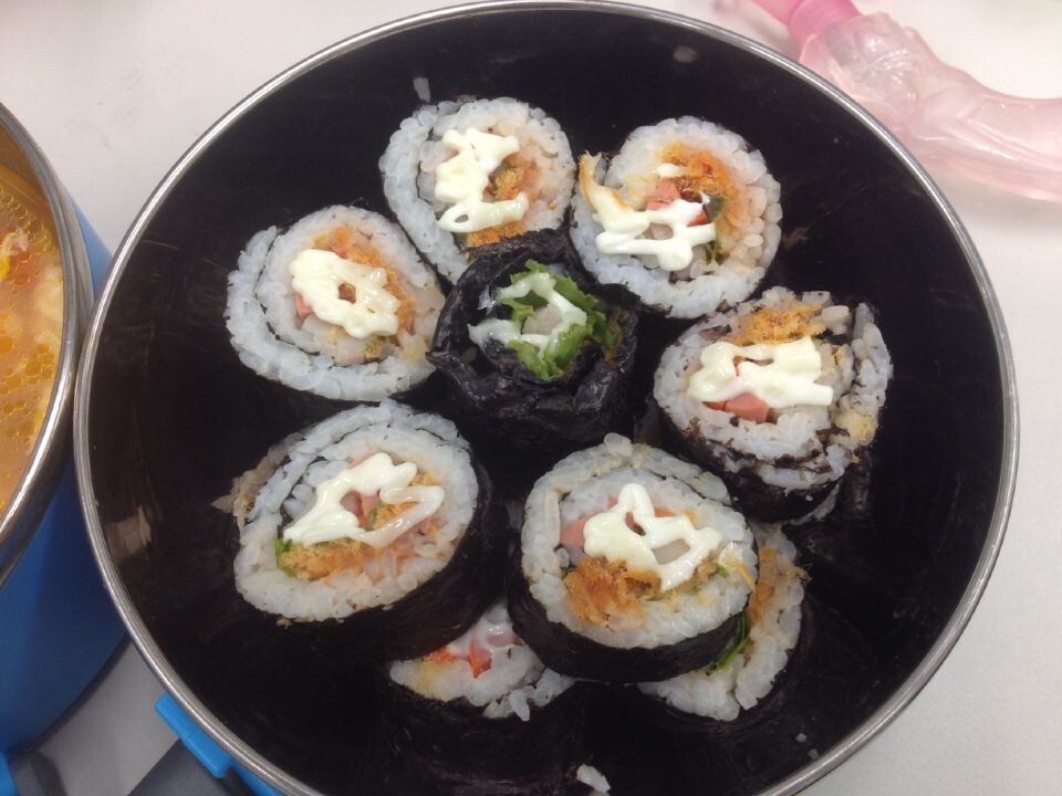 我的老媽是很潮的,哈哈哈,平時就喜歡帶我去吃什么韓餐日料,這壽司自然是最基礎版的啦~~!她老人家一時興起買了材料,我足足吃了一周的壽司早餐。哈哈!不過還好,媽咪做的,餡兒都不同,滿滿都是愛呀!老媽,愛你~~