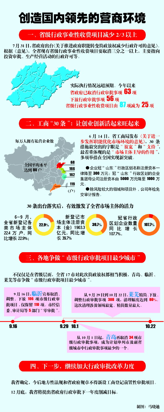 3月底,“創造國內領先的營商環境”這一提法首次在山東出現。在短短7個月時間里,全省推進政府職能轉變、減少行政許可、理順政府與市場關系,改革步伐大大超出預期。