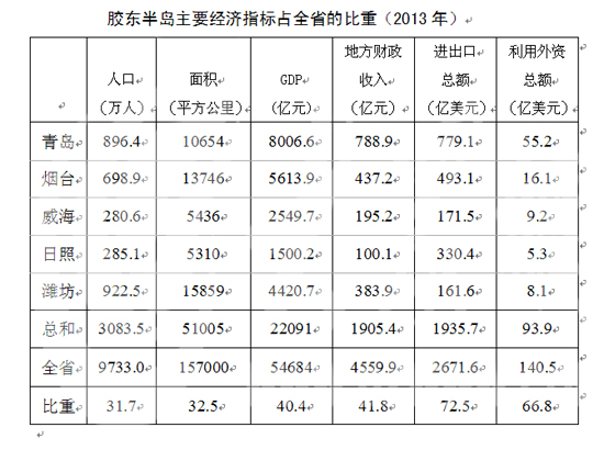 作為中國第一大半島的膠東半島,是山東經(jīng)濟實力最強、開放型經(jīng)濟水平最高、發(fā)展活力足、科研力量較為雄厚的地區(qū)。山東宏觀經(jīng)濟研究院經(jīng)濟研究所所長高福一介紹,2013年,膠東半島五市,以不足1/3的人口和面積,創(chuàng)造了均超過五分之二的地區(qū)生產(chǎn)總值和地方財政收入,而且進(jìn)出口總額接近3/4,利用外資超過2/3。