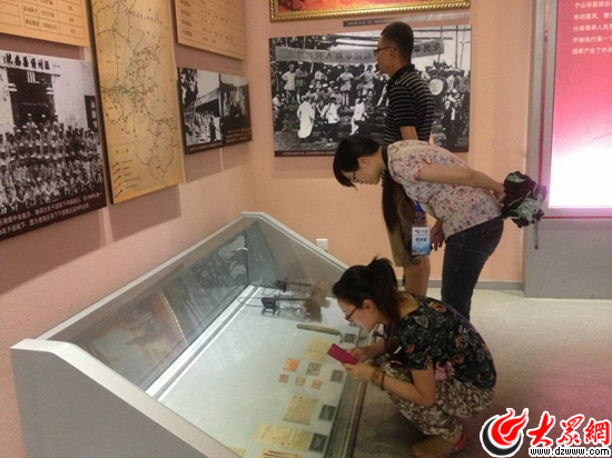 “聚焦美麗山東-第九屆中國網絡媒體山東行”南線采訪團來到了莒南八路軍115師司令部中共山東分局、山東省政府誕生地。圖為媒體記者在觀看革命年代留下的珍貴資料。(大眾網記者 李兆輝攝)