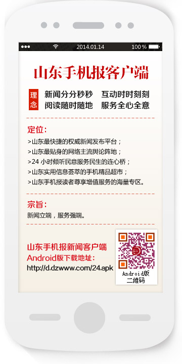 山東手機報將以“傳播主流新聞、弘揚山東精神、網聚齊魯民聲、服務山東百姓”為辦報理念,有效傳達中央以及省委省政府聲音,服務經濟文化強省建設大局,努力辦中國最好的手機報和客戶端,推動山東手機報與大眾日報、山東廣播電視臺共同構建山東“兩報兩臺”、傳統媒...[詳細]