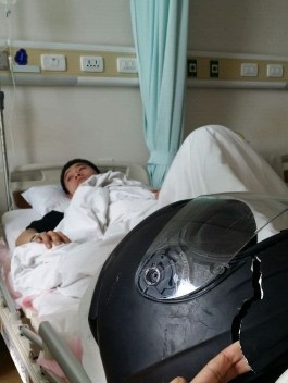 王晶頭戴的頭盔已經摔碎,頭盔背面已經磨平。