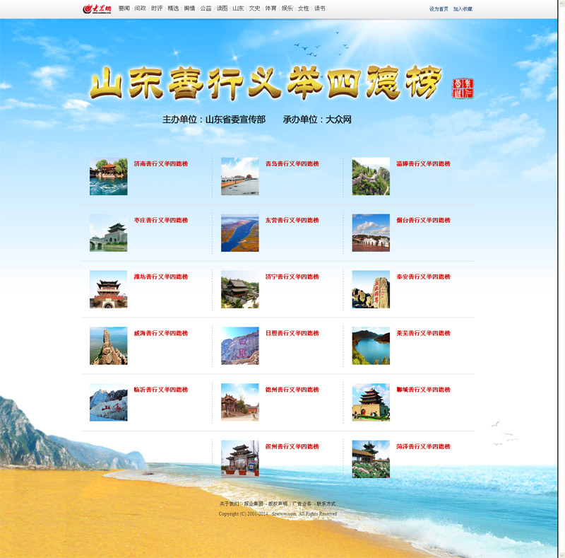 為進(jìn)一步培育和踐行社會(huì)主義核心價(jià)值觀,落實(shí)中宣部和山東省委推廣善行義舉榜現(xiàn)場(chǎng)會(huì)會(huì)議精神,由山東省委宣傳部主辦、大眾網(wǎng)承建的“山東善行義舉四德榜”網(wǎng)上展示平臺(tái)日前開(kāi)始試運(yùn)行。