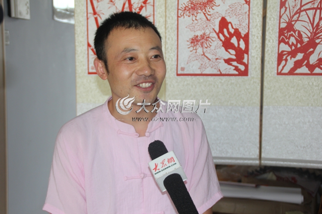 國家級非物質文化遺產剪紙項目傳承人李金波接受大眾網記者采訪。