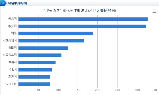 從媒體報道來看,今年“部長通道”的亮點頗多,既有各個部長主動回應社會熱點關切,也有部長與記者們的友好互動花絮,引得媒體記者們紛紛點贊叫好。據大眾網輿情監測中心統計,截至3月10日上午11時,有關“部長通報”的相關新聞報道達到5850篇,微博4709條,其中《10部長受訪“部長通道”掀起小高潮》、《20位部長主動站到“部長通道”回應熱點問題》、《“部長通道”開啟 記者“嚴陣以待”》、《兩會新聞特寫:部長通道又啟 回應社會關切》等成為媒體報道的熱門文章。而新浪、搜狐、網易、中國新聞網、鳳凰網占據“部長通道”媒體報道數量前五。參與報道的韓國中央日報記者申庚振對部長通道的親民、開放、接地氣的中國特色交流方式給予了高度評價。人民日報表示“部長通道,體現著中國特色社會主義民主政治的發展進步,向全世界展示著中國自信和開放的腳步!
