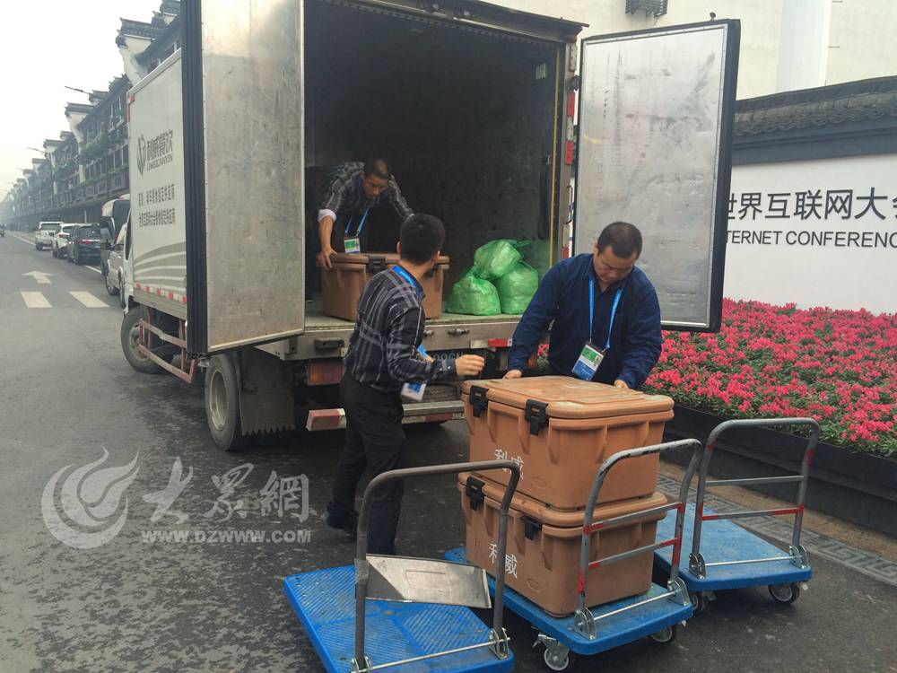 在烏鎮(zhèn)互聯(lián)網(wǎng)國(guó)際會(huì)展中心門前,大會(huì)指定餐飲供應(yīng)商正在向會(huì)展中心供應(yīng)膳食。大眾網(wǎng)特派記者 李兆輝 攝