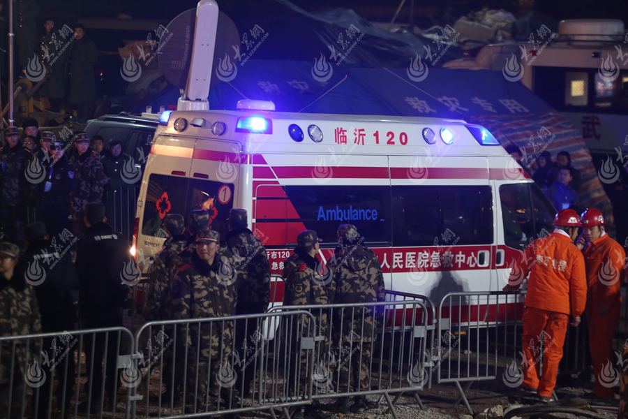 1月29日晚,平邑“12.25”石膏礦坍塌事故救援現場救護車嚴陣以待。(大眾網攝影師王鈞生 攝)