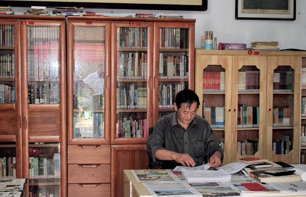 長(zhǎng)期的工作經(jīng)歷使鑒兆飛具有高度的政治敏銳性,他在讀書(shū)、看報(bào)中深刻體會(huì)到全國(guó)從上到下對(duì)發(fā)展文化事業(yè)的熱。2010 年退休后,看到老家鄉(xiāng)親們精神文化生活比較匱乏,他就決定自籌資金,利用老家的六間院落創(chuàng)辦鄉(xiāng)村書(shū)屋。“一來(lái)呢,我身體不好,不能干重活了,想著力所能及為社會(huì)做些事,精神上也有個(gè)寄托。二來(lái)呢,村民農(nóng)閑時(shí)也有個(gè)讀書(shū)看報(bào)的地方,村里的孩子放學(xué)后有個(gè)學(xué)習(xí)交流的地方,能夠方便大伙兒。”談起創(chuàng)辦鄉(xiāng)村書(shū)屋的初衷,鑒兆飛輕描淡寫(xiě)地說(shuō)。