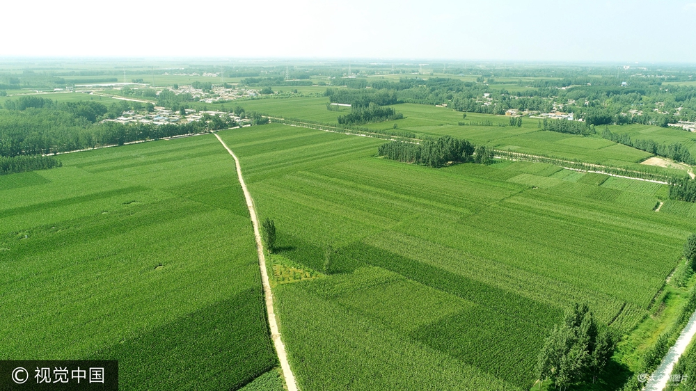 2017年8月15日,山東聊城,航拍茌平縣杜郎口鎮張海子村、張官屯村上千畝玉米大田,綠油油的玉米長勢喜人,高空俯覽下的村莊、玉米大田、田間小路猶如一幅幅美麗的鄉村詩情畫卷。據悉,目前茌平縣80多萬畝玉米,正進入授粉階段,長勢旺盛。農民朋友喜上眉梢,祈盼秋收時節玉米豐收。圖片作者:史奎華/視覺中國