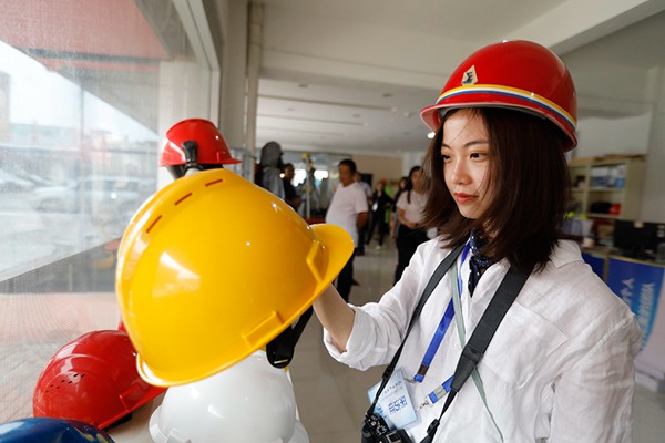采訪團記者體驗勞保用品。