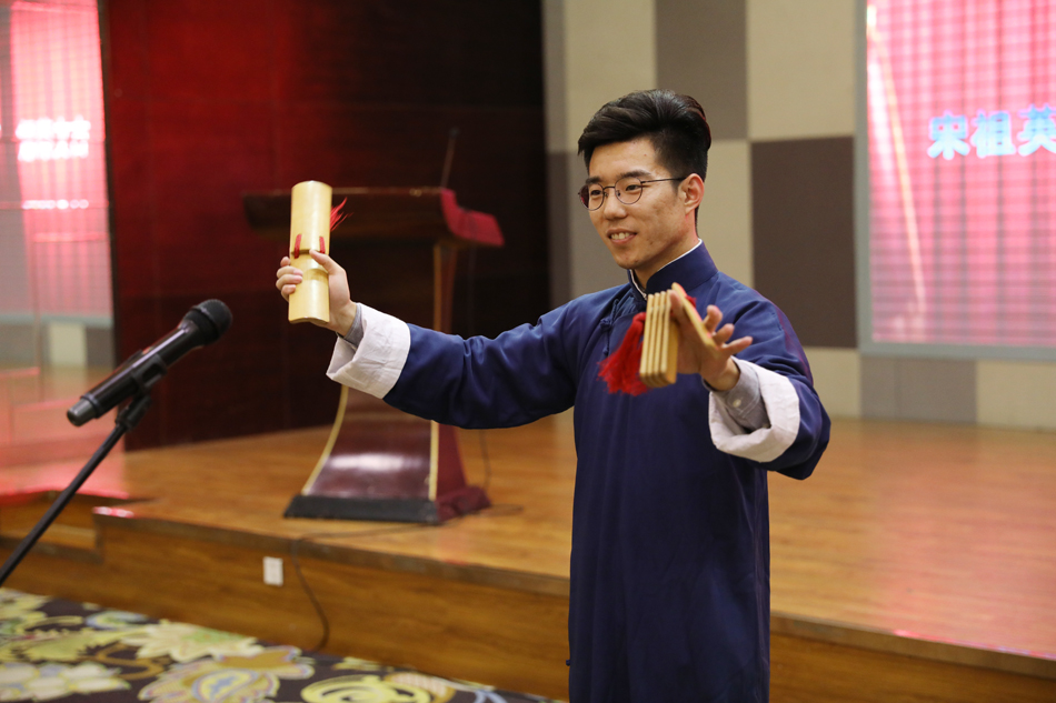 大眾網(wǎng)記者在晚餐時為大家表演山東快書助興。