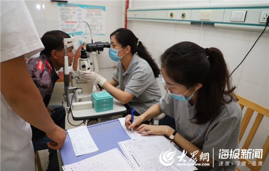 山東大學第二醫院眼科青年醫生張曉陽與志愿者棗莊市市中區人民醫院眼科主任湯靜搭檔進行裂隙燈檢查,一天共登記填寫了200多份患者信息卡。(仇晶 攝)