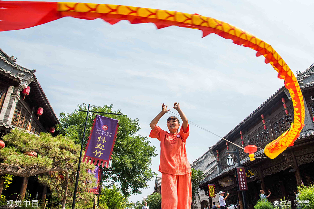 2019年6月12日,非遺傳承人在山東省濰坊青州市古城景區表演空竹龍。