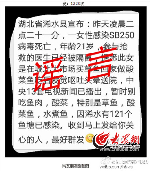3月20日前后,在不少聊城網民的手機朋友圈、QQ群中出現這樣一條消息:“山東聊城防疫局宣布:昨天凌晨二點二十一分,一女性感染SB250病毒死亡,年齡21歲,參與搶救的醫生已經隔離。據悉此女是在市場買鯇魚回家做酸菜魚吃后發覺嘔吐頭暈送院,中央13套電視新聞已播出,暫時別吃魚肉、酸菜,特別是鯇魚、酸菜魚、水煮魚,因聊城121個魚塘已感染。收到馬上發給你關心的人,最好群發。”