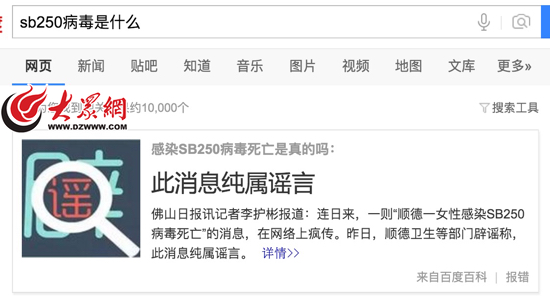 在網上搜索“SB250病毒”,搜索引擎會標注提示其為謠言。
