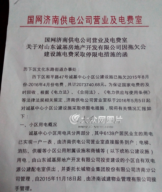 事情是否屬實?隨后,大眾網記者采訪了國家電網濟南供電公司的相關工作人員,確實如小區物業所言,今年4月26日,供電公司曾給歷下區文化東路街道辦事處發函,稱誠基中心公建設施已拖欠2015年8月至2016年4月的電費,共計207.37萬元。他們根據電力法、合同法等法律法規,在5月5日對公建設施進行限電。