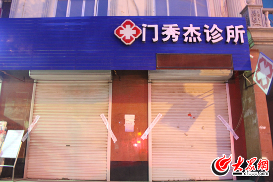 案發后,霸州市公安局在門秀杰診所的門上貼上了封條。(盛堃 攝)
