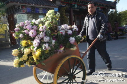 38歲的孟慶華說,在本次菊展中,護城河邊游船碼頭上擺放的菊花已經開敗,昨天他用手推車將碼頭上的菊花清理出來,“有些還可以繼續開放的菊花讓市民領走了,還有些不能觀賞的菊花就集中放在了解放閣后面,然后用清運車運走。”