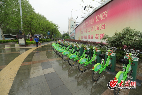 4月18日,在濟南泉城路附近,不時有騎著“小橙車”的年輕男女經過,“小綠車”的舜井街站點處卻無人問津。大眾網記者 王長坤 攝