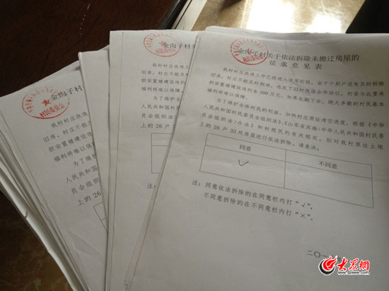 今年1月9日,金溝子村召開村民大會,向占全體村民99%的上樓戶發放“依法拆除未搬遷房屋的征求意見表”,其中有90%以上的村民在同意欄打了對號。