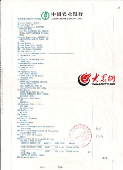 從事外貿(mào)工作近20年的王梅(化名)仔細(xì)看過這份由韓方向我國蒜農(nóng)出具的信用證后說,其兌付條件非?量,主動權(quán)幾乎全部在韓方,一旦大蒜被退運,蒜農(nóng)利益將無法保障。(該照片為信用證的一部分)(大眾網(wǎng)記者 李兆輝 攝)