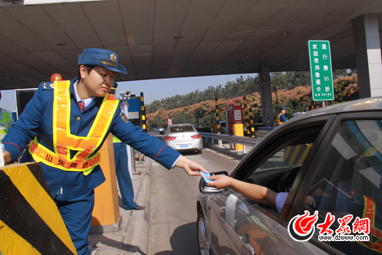 在6個收費通道全部打開的同時,為了縮短司機在上路前領卡的過程中耽誤時間,提高車輛通行效率,濟南西收費站的工作人員還在每個收費通道前設置里1到2名人工發卡員。發卡員直接將卡發到司機手里,之后車輛便可快速通過收費口。