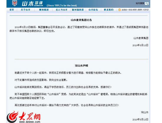 山木教育集團官方網站發布宋山木辭職公告和其個人聲明。
