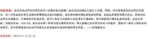 記者了解到,7月5日,煙臺開發(fā)區(qū)旅游局在對網(wǎng)友投訴的回復中終于公開道歉。記者在7月5日下午煙臺開發(fā)區(qū)旅游局的網(wǎng)上市民對話中看到,該局對在金沙灘景區(qū)中遭遇經(jīng)營攤主亂收費的網(wǎng)友回復中表示:我們(旅游局)對這位攤主已進行了處理,同時,“作為管理者向這位網(wǎng)友及朋友、家人為您在我們景區(qū)出現(xiàn)這種事情表達我們的歉意,我們將加強對攤位經(jīng)營者的管理,杜絕此類事件的再次發(fā)生!