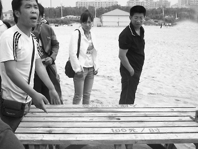 煙臺開發(fā)區(qū)4A級景區(qū)——金沙灘海水浴場,幾塊木頭板子搭起了板凳,居然明碼標(biāo)價(jià)“100元/小時(shí)”。