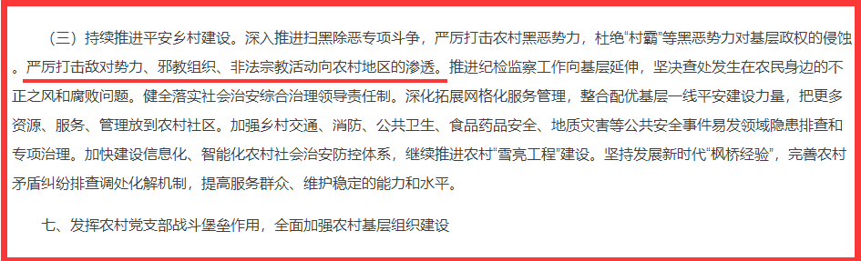文件第六部分“完善鄉村治理機制,保持農村社會和諧穩定”第三項為“持續推進平安鄉村建設”,明確指出:“嚴厲打擊敵對勢力、邪教組織、非法宗教活動向農村地區的滲透!