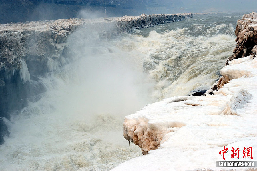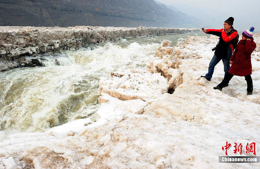 2月12日,來自西安游客站在吉縣一側(cè)黃河壺口冰封撕裂層面上拍照留念。近日,隨著氣溫的回升,封凍月余的黃河壺口瀑布開始消融,形成一條30多米長、10多米寬的壺槽,給初春的壺口瀑布帶來勃勃生機(jī)。中新社發(fā)袁景智 攝 圖片來源