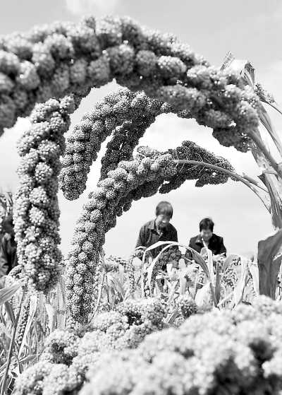 2011年全國糧食總產量11424億斤,比2010年增產495億斤,增長4.5%。圖為山東省沂源縣南魯山鎮陳家山村的農民在采收成熟的谷子。(新華社發)