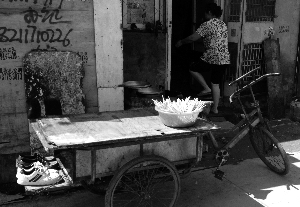 在這條巷子里,除了周師傅家外,還有幾家是做早點的,路邊已經擱了幾盆正在晾曬的筷子。“他們每天上午10點來鐘收攤后就洗筷子。天氣涼快的時候在屋外洗,熱的時候在屋內洗。洗完后就將筷子擱外面,一直到下午才收,也不管落不落灰。”胡同里的居民宋女士告訴記者。