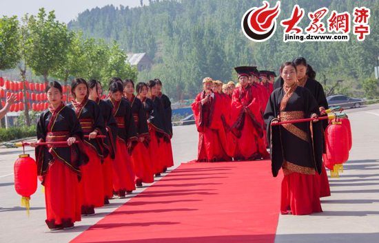 大眾網濟寧4月29日訊(記者 朱仙娉 史欣欣)28日上午,有著千年歷史的上九古村迎來了一批特殊的客人。他們身著漢服華裳,頭帶額冠,踏著悠揚的古樂款款而來,在這里舉行了一場儒家婚典儀式。