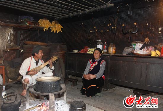怒族舞蹈中的達比亞舞是以一種形似琵琶的彈撥樂器作為伴奏,歐得得就是伴奏者,他善于彈唱,能給大家?guī)須g樂。歐得得家在山上,茅草頂,草席墻,日常的生活必需品都需要到山下購買,然后用竹筐背上山。房子是竹木結構,屋內的裝飾也很簡單,墻上掛著的幾支野羊角,羊角上的蛋殼,墻邊的木柜,歐得得的生活簡單而質樸。歐得得正在彈奏的樂器叫達底達變,是祖輩們傳下來的四弦樂器,彈奏的位置多變,姿態(tài)豐富,可以高彈低彈,上彈下彈,反彈正彈。在表現形式上,由歐得得的伴奏的達比亞舞分為單人、雙人、集體等多種形式。這是歐得得正和他的妻子一起表演怒族的情歌對唱。歐得得會六十余種歌舞,他的舞步節(jié)奏穩(wěn)健,以膝關節(jié)帶韌性的屈伸顫動為主,再加上腳的動作,讓他練就了一雙鐵腳板,門口處的木地板就是歐得得家永不閉幕的舞臺。他希望有更多的人了解達底達變,好讓這古老的舞蹈傳承下去。