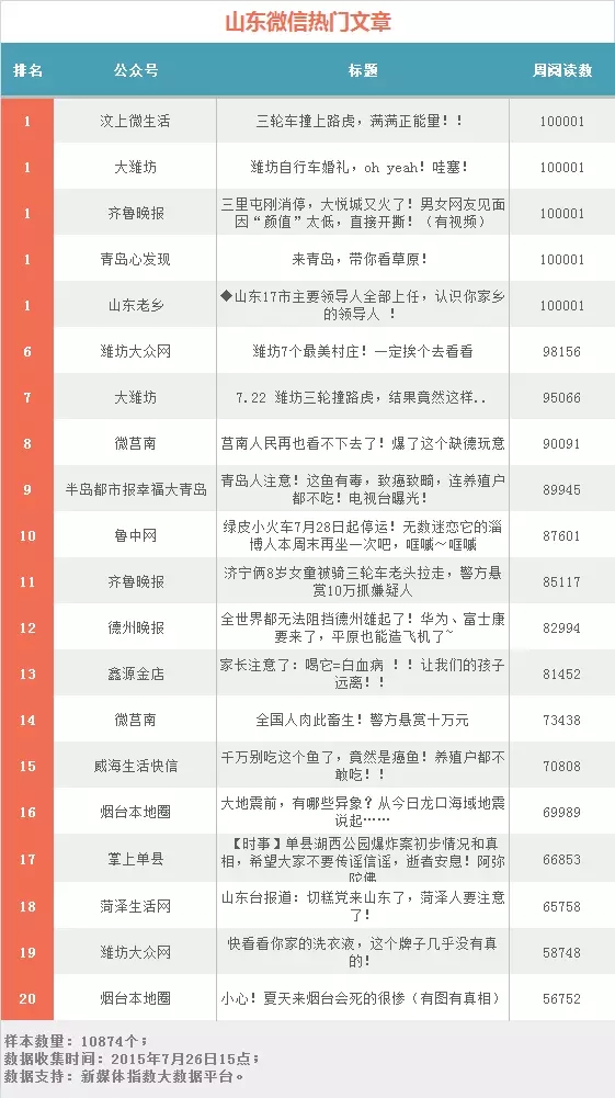 本期山東微信影響力排行榜前兩名由來自濰坊的兩個賬號“濰坊大眾網”和“大濰坊”奪得,“濰坊大眾網”依舊以閱讀總數過百萬的傲人成績領銜榜單。前十名上榜賬號中排名進步較大的有“鑫源金店”和“煙臺大眾網”,他們憑借兒童白血病防范和菜市場電子稱的貓膩等話題分別進步30個和18個名次。與上期相比,“汶上微生活”、“掌上單縣”、“青島張磊”、“青島心發現”、“濱州在線網”、“淘嘉祥”、“掌上濱州”、“菏澤日報”、“樂活青島”、“山東電視生活頻道”、“萊蕪都市網”等11個賬號新入50強。熱門文章榜中三輪車撞上路虎、濟寧兩名女童失蹤、有毒多寶魚等主題集中出現。