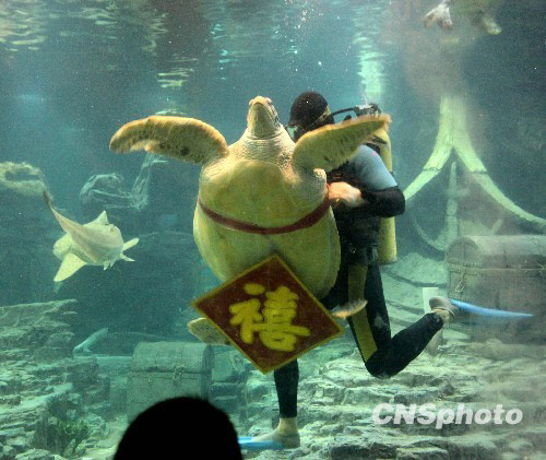 2月7日,武漢東湖海洋世界的企鵝、海龜紛紛穿上節日“盛裝”,喜迎新春。中新社發 王振武 攝