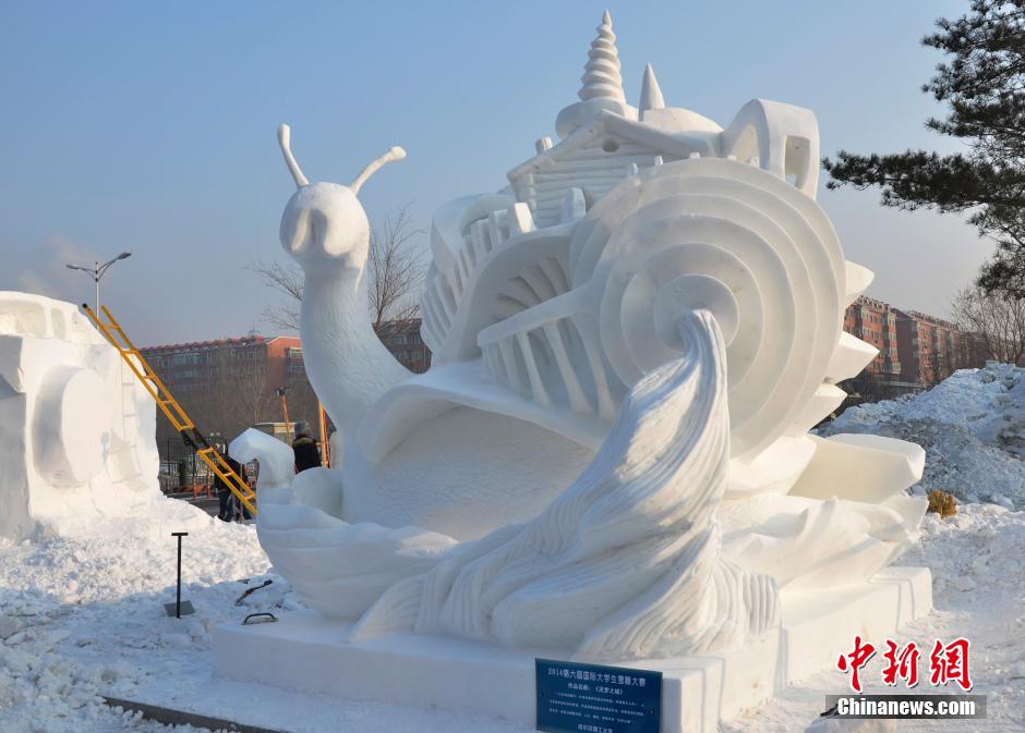 1月7日,第六屆國際大學生雪雕比賽在哈爾濱工程大學閉幕。來自中國、俄羅斯、英國、日本、韓國、朝鮮、泰國、馬來西亞、丹麥、臺灣、香港11個國家和地區的61所高校的大學生們在這里展示了他們的作品。圖為哈爾濱理工大學《靈夢之城》獲得本次比賽特等獎。中新社發胡迪攝