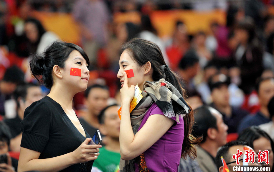11月21日晚,亞運會男子籃球迎來中韓強強對抗,吸引了眾多球迷到場觀戰,兩位美女球迷賽前細心在臉上貼上國旗。中新社記者 柯小軍 攝
