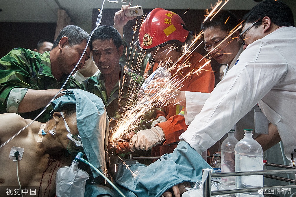 2012年6月12日,杭州,凌晨的醫院急診室內,工友、消防員和醫生齊力對插入農民工鄭師傅身體的七根鋼筋進行切割。前一天下午,鄭師傅在福建的工地上干活時,被盤轉機器上突然斷掉彈出的鋼筋插進了身體。因當地醫院無法手術,輾轉至杭州。
