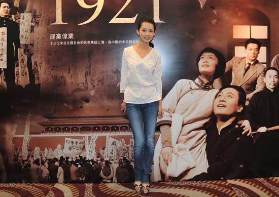 李沁在《建黨偉業(yè)》巨幅海報前留影
