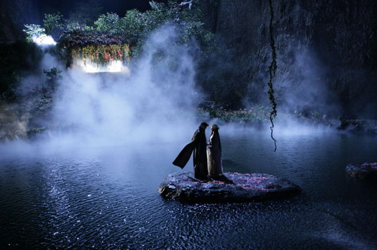 洞 天 福 地 絕美程度:★★★★★ 經典劇情:十六年后楊過與小龍女重逢 相較于前面兩個景別都是人工搭建達到以假亂真的效果, “洞天福地”則是天然與人工的巧妙結合。拍攝“洞天福地”的場所是在雁蕩山山頂,四面由山峰環抱,有一個近一千平米的水池,由雨水積蓄而成,劇組于是借助這個地理,巧妙的改裝,在水池中央安上一塊巨石,使期格局頗似古墓,并搭出一個花棚做為小龍女在谷底生活了十六年的處所,水池四周安上霧氣管,霧氣一放頗似仙境。 背后的故事: 因為四面環山,也增加了燈光師的難度,隨意的擺放燈光容易在鏡頭里穿幫,頂部又是露天,于是劇組就是兩山之間連接起鋼絲,把幾千瓦的燈直接掛在鋼絲上;拍攝地點位于山頂,通往山頂只有一條長約三公路的狹小山路,每次的拍攝道具,攝影器材、工具一律由人工扛上山。而制造霧氣所需的水源,拍攝的前幾天選擇直接用水池中的水,但因為水池的水過于污濁,致使霧氣管被堵塞而“罷工”。一百萬的制霧器材不得不重新置換,而制造水霧用的水劇組也只得選用純靜水,由工作人員一桶桶的搬運?span class=yqlink>仙劍刻於夾韜姆巖話僂八笥搖?/p> 正因為工作人員的付出,演員的投入才造就了這一切觀眾在電視里看到的美景,精彩的電視劇背后,也有著非比尋常的故事。